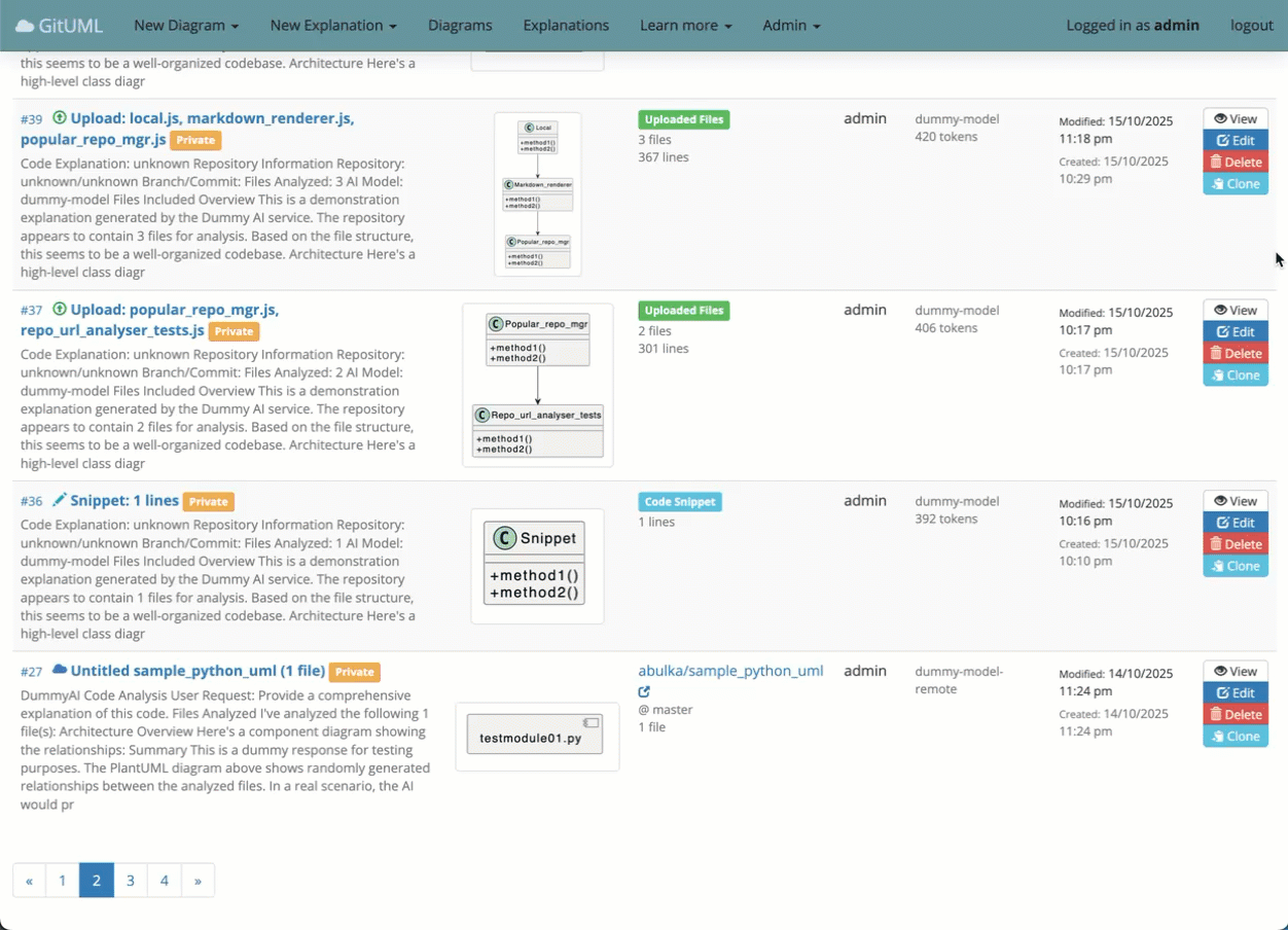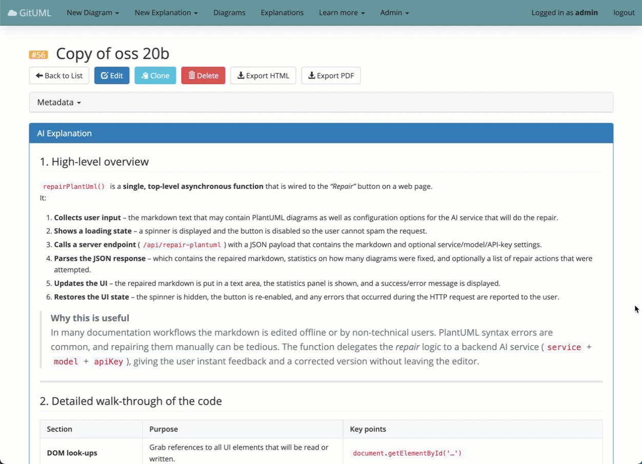 GitUML builds Structured Knowledge. Generate professional documentation (HTML/Markdown/PDF) that you can save to your repo, share with your team, or use for client handovers.
